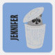 Create some personalized stickers that are perfect for fans of raccoons. These stickers feature a cute illustration of a raccoon peering out of a garbage can with your name or other message in bold black lettering all set against a light blue background.