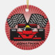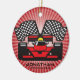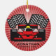 Personalized Race Car Ornament against a starburst background. All text customizable, front and back!