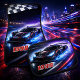 Feel the thrill of the race with these electrifying racing car floor mats. Designed for true automotive enthusiasts, this graphic-based design features a sleek, dark-colored sports car speeding down a track at night. The vibrant blue and red light trails, combined with crackling electric blue energy emanating from the wheels, create a dynamic and high-octane visual that captures the essence of speed. The custom bold red text adds a vintage racing flair. Perfect for adding a personalized touch to your car's interior while protecting your floors with style and attitude.