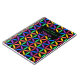 Abstract geometric design of interlacing circles, bright rainbow colors on black background