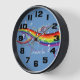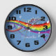 White musical notes floating on a rainbow of swirling colors on a bluebackground. The background color can be changed by clicking on the customize button. Customize the text to create a unique personalized musical design clock. Perfect for the music lover.