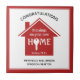A stylish NEW HOME ceramic tile, designed as a realtor-to-client closing gift. ALL TEXT IS FULLY CUSTOMIZABLE so you can personalize the wording to suit your corporate branding. The text reads CONGRATULATIONS, BLESSINGS ON YOUR NEW HOME with Joshua 24:15 Bible verse - As for me and my house, we will serve the Lord. The image shows a RED house with white typography. The O of HOME is replaced with a key. At the bottom, you can add your name and company name, or personal message to your client (up to three lines recommended). Matching items available so you can create corporate gift sets for your clients. Other colors available.