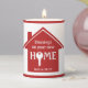 A stylish NEW HOME Pillar Candle, designed as a realtor-to-client closing gift. ALL TEXT IS FULLY CUSTOMIZABLE so you can personalize the wording to suit your corporate branding. The text reads CONGRATULATIONS, BLESSINGS ON YOUR NEW HOME with Joshua 24:15 Bible verse - As for me and my house, we will serve the Lord. The image shows a RED house with white typography. The O of HOME is replaced with a key. At the bottom right, you can add your name and company name, and your contact details. This will appear on the right hand side. On the left, you can also add a message of Congratulations and/or greeting to the new homeowner. Matching items available so you can create corporate gift sets for your clients. Other colors available.