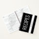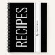 Personalized recipe development notebook in bold and modern black and white editable color with a large print title of "Recipes by... and your name" printed on the cover in a modern sans serif font.