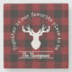 The product design features a silhouette of a deer on a classic red and black buffalo plaid pattern. Combined with your own personalized text, this composition makes a rustic, modern, and unique stone coaster.