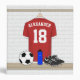 A fresh new version of GiftsBonanza's unique football soccer jersey sports design featuring a red and white soccer jersey hanging in a locker room with a soccer ball, water bottle and football cleats on the bench. The soccer jersey has customizable text for the name of the soccer player, soccer coach or soccer fan and number or age.