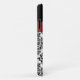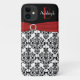 Personalized modern red, black, and white damask Case-Mate Barely There™ iPhone 11 Case with PRINTED ribbon and jeweled brooch.