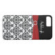 Personalized modern red, black, and white damask Barely There™ iPhone 7 case with PRINTED ribbon and jewelled brooch.