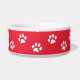 Spoil your dog with this personalized dog bowl. It has a background with dog paws on it There's a big white dog bone in the center where you personalize with your dog's name.