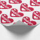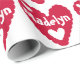 Valentine's Day gift wrap paper features a red heart with smaller white hearts and white text that you can personalize with a name on a white background.
