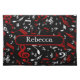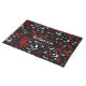 Perfect gift for the music lover or musician with a design featuring a random jumbled pattern of musical notes and treble clefs in red and white on a classical black background. Easy to customize with your own text on a coordinating accent.