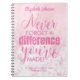 A striking personalized retirement notebook. This beautiful typography designed notebook would be perfect as a retirement gift for a nurse, physician or teacher. The quote 'Never forget the difference you've made' is featured in pink typography on a pale pinkl background. Add your own message and recipients name to make a truly unique and personal gift idea.