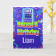 This arcade-themed 8th birthday card features a retro gaming machine with the text “Party Loading …” and a “Level Up” birthday cake next to it. The design includes fun arcade elements such as a rocket, spaceship, ghost, stars, airplane, jet, and neon circles. The Level 8 displayed at the top of the machine and the birthday boy's name personalized makes this a truly cool birthday card.