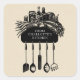 A retro style food label featuring a utensil rack with cooking utensils and an array of fresh food on the top, against a cream faux linen background. A perfect gift for the avid cook, and a great choice for Mother's Day.