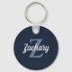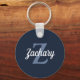 This personalized keychain features a grayish blue monogram and white retro script name on a navy blue background.