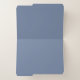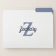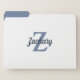 These personalized file folders feature a blue gray monogram and navy blue retro script name on a white background. The inside of the folders is solid blue gray.