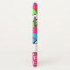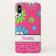 This colorful iPhone case features a retro and trendy pink, blue lime green and white peace sign flower pattern and the name of your choice.