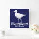 Personalized retro sea bird square wall clock. Sea bird on shore with a text field at bottom center. Blue and white.
