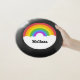 This Frisbee features an illustration of a rainbow in a retro style in bright colors with white clouds beneath it. It's ready to be personalized with a name or other text in bold black lettering against the white clouds background.