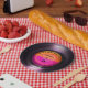 Pink and orange birthday party paper plates for a retro or disco dance birthday party. Vinyl record pop art style birthday party plates.