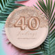 The top half of this chic, girly design features a pattern of sparkly rose gold leopard spots on a blush pink background, with "40" in large rose gold balloon numbers. Add the guest of honor's name in elegant dark rose handwriting script on a blush background, with the words "40th birthday party in sans serif font below.