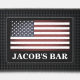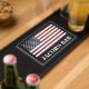 Personalized rubber bar mat with American flag. Handy for beer glasses and other alcohol drinks. Modern typography template. Patriotic design printed with custom text. Great for home bar, pub, cafe, party, mancave, sports club, cabin, office and more. Unique Birthday gift ideas. Make one for dad, father, uncle, brother, grandpa, player, fan etc. Vintage USA flag with stars and stripes.