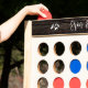 Add some outdoor fun to your wedding reception or cocktail hour, and then enjoy for years to come! Personalized fast four lawn game set features your names in modern calligraphy script lettering accented with leaves on a rustic wood-print background. Add your wedding date beneath, and your family name along the sides for a unique addition to your wedding.