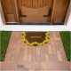 Brown rounded doormat is edged with rustic faux watercolor sunflowers Personalization is shown in a coordinating shade of golden yellow. The font used for display is Reggae - which you can change to any other type/font you may prefer. The size and color of the wording can be changed as well.