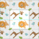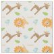 Adorable fabric design features an orange lion, a brown giraffe, two blue birds, and a green leaf and can be personalized with your child's name or any text of your choice.