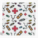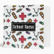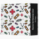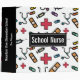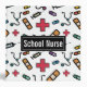 Personalized School Nurse Colorful Medical Pattern 3 Ring Binder for School Notes. Spine has black background and can be personalized with school, name or other information. Text reads SCHOOL NURSE on white background with pattern of red medical first aid symbol, band-aid, medicine and stethoscope. Fun gift for your favorite school nurse.