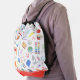 Add a special touch to the school supplies of your young boy or girl with this custom drawstring bag. Bag has a pattern of school-related items like pencils, crayons, sports equipment, art supplies, math supplies, and more. For a personalized touch, add your kid's name at the bottom, or other text.
