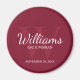 This magnet features personalized groomsman's name in white classic script font style with wedding details in white classic serif font style and monogram in light burgundy red classic serif font style as background, on burgundy red background.