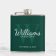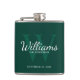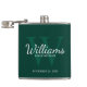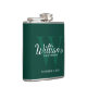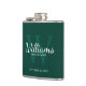 This flask features personalized groomsman's name in white classic script font style with wedding details in white classic serif font style and monogram in light emerald green classic serif font style as background, on emerald green background.