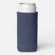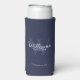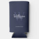 This can cooler features personalized groomsman's name in white classic script font style with wedding details in white classic serif font style and monogram in light navy blue classic serif font style as background, on navy blue background.