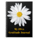 This personalized notebook has a large white and yellow Shasta Daisy flower head on a black background (customizable) with bold yellow text that says, "My 20xx Gratitude Journal" on it that can be changed to say whatever you want it to.