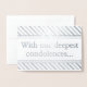 This custom, personalized silver foil condolences greeting card design features the message "With our deepest condolences…" on the front, along with a customized message on the inside. It could perhaps be used to offer sympathy to somebody who has suffered ill fortune.