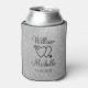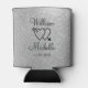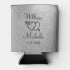 Custom shiny faux silver glitter wedding can coolers. Personalized wedding can cooler for guests. SIlvery design. Fancy sparkly glimmers wedding bottle holders with cute heart and arrow. Classy glittery design with name or monogram letters. Romantic love symbol design. Make one for with for team groom, groomsmen, best man, ring bearer etc. Create your own cosy wedding favor / souvenir for guests at your party. Romantic theme beverage holder design. Perfect for alcoholic drinks like beer. Also available for bottles. Elegant script typography. Custom background color. Sparkling luxury style cozy cooler for chic wedding, fancy bridal party, fun bachelorette party etc.