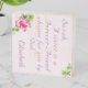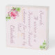 Design features a pale pink background to the image of a bright pink rose amid leaves. Customizable text is displayed in a burgundy-colored script and reads, "A sister is a Forever-Friend chosen for you by God." Signature follows. All text is customizable.