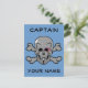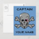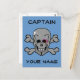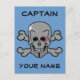 A Skull and cross bones, Jolly roger with customizable text. The text reads captain, and has a place to put your name or a name of a boat. The skull is grey and black and is decorated with a pink eye. Behind the skull there are two crossed leg bones.
