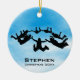 Sky Diving Free Fall Personalized Ornament Christmas 20XX. Skydivers form a free-fall circle against a blue sky with clouds background. All text customizable, front and back!