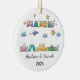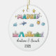 A Personalized Travel Souvenir Ornament designed to celebrate your unforgettable trip. Whether you went for work, enjoyed a romantic getaway, or took part in a school exchange program, this ornament commemorates a special moment you’ll always cherish and want to remember for years to come. This vibrant skyline ornament featuring cityscapes, dreamy clouds, and twinkling stars. Perfect for travelers and city lovers alike!