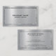 Personalized, slick metallic silver-gray texture print background, stainless steel with shiny silver-toned border accents, business card template. Customizable black typography.