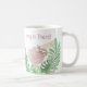 This cute mug is decorated with a watercolor of a smiling sloth hanging from a branch with tropical leaves and the words Hang In There!