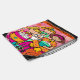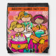 Cute and colorful slumber party drawstring bag, easy to personalize with a name, features three girls at a slumber party eating popcorn, a flowered background, sleeping bag, and nail polish!