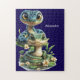 This blue puzzle with two snakes on it can be personalized with any name you would like.