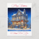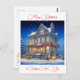 Seasonal winter house illuminated on a snowy night personalized Christmas card.