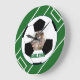 A fun soccer ball design fully customizable with your own name or text and photograph, featuring a soccer ball on a green soccer pitch. Personalize the custom text is in a coordinating green. Ideal gift for the soccer player in your life.
