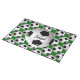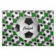 A football soccer ball design which is fully customizable with your own name or text. The background features a pattern of soccer balls on a football pitch green. Ideal for any soccer player, football coach or soccer fan.