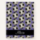 Grunge design soccer balls patterned on front of notebook with name on front lower section