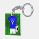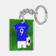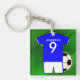 A great gift for any budding soccer football star, sports fan or keen soccer supporter featuring a blue and white soccer jersey with your name and number with a football and green modern football pitch background.